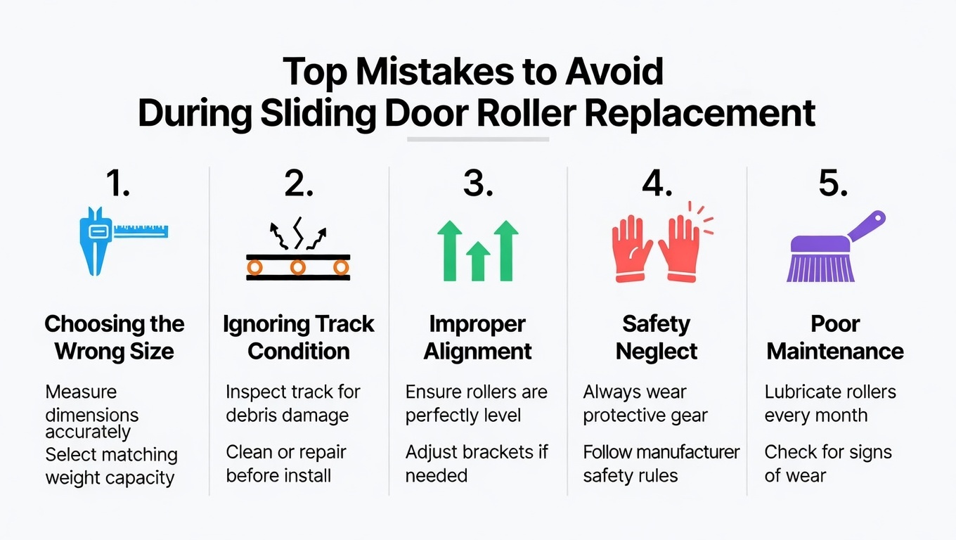 | Verkeerde rolgrootte | De deur zit vreemd, gaat niet op slot en sleept nog steeds | Diameter/offset/belastingswaarde komt niet overeen | Zorg ervoor dat de rolspecificaties overeenkomen met het origineel; controleer de wieldiameter en behuizingsdiepte |